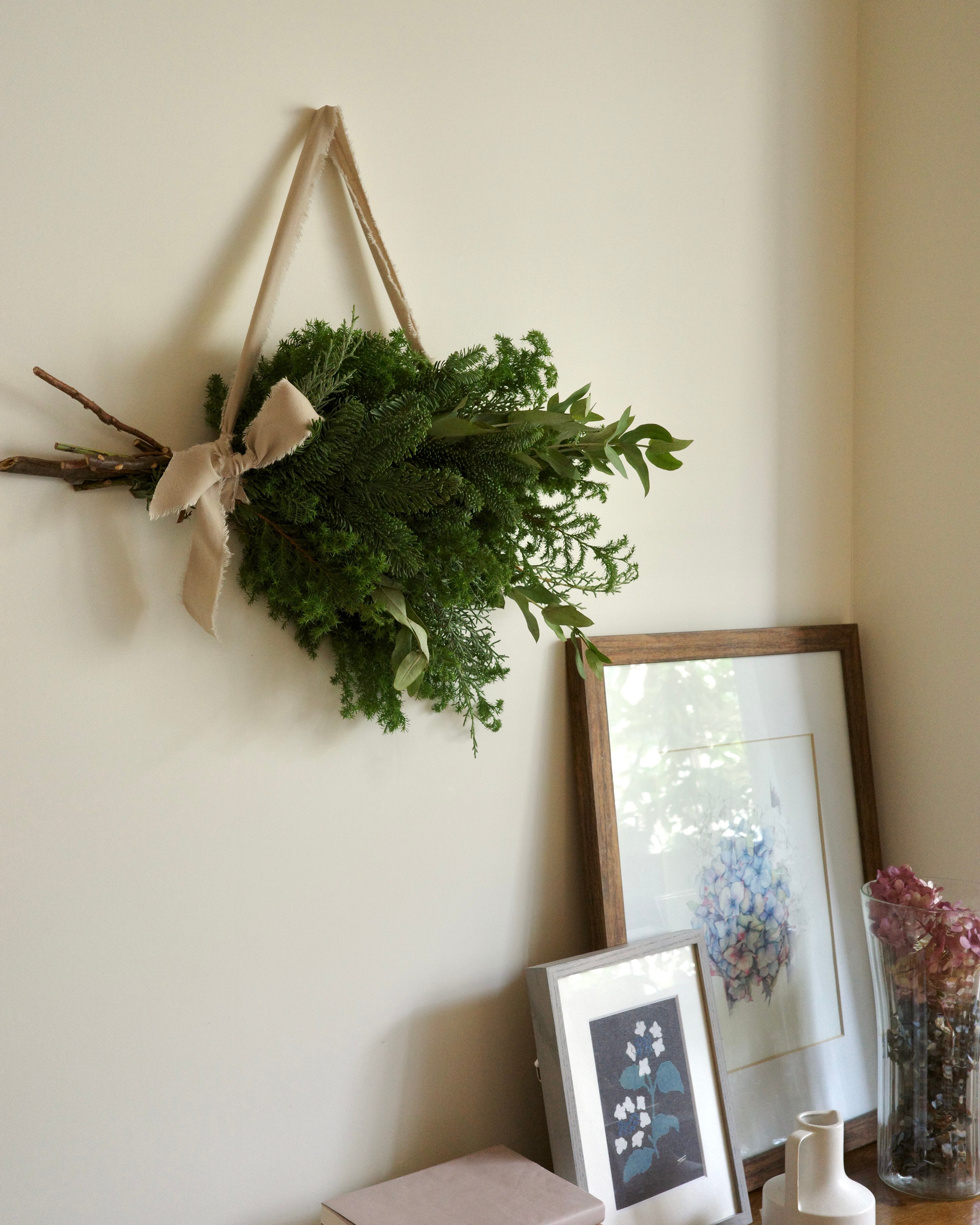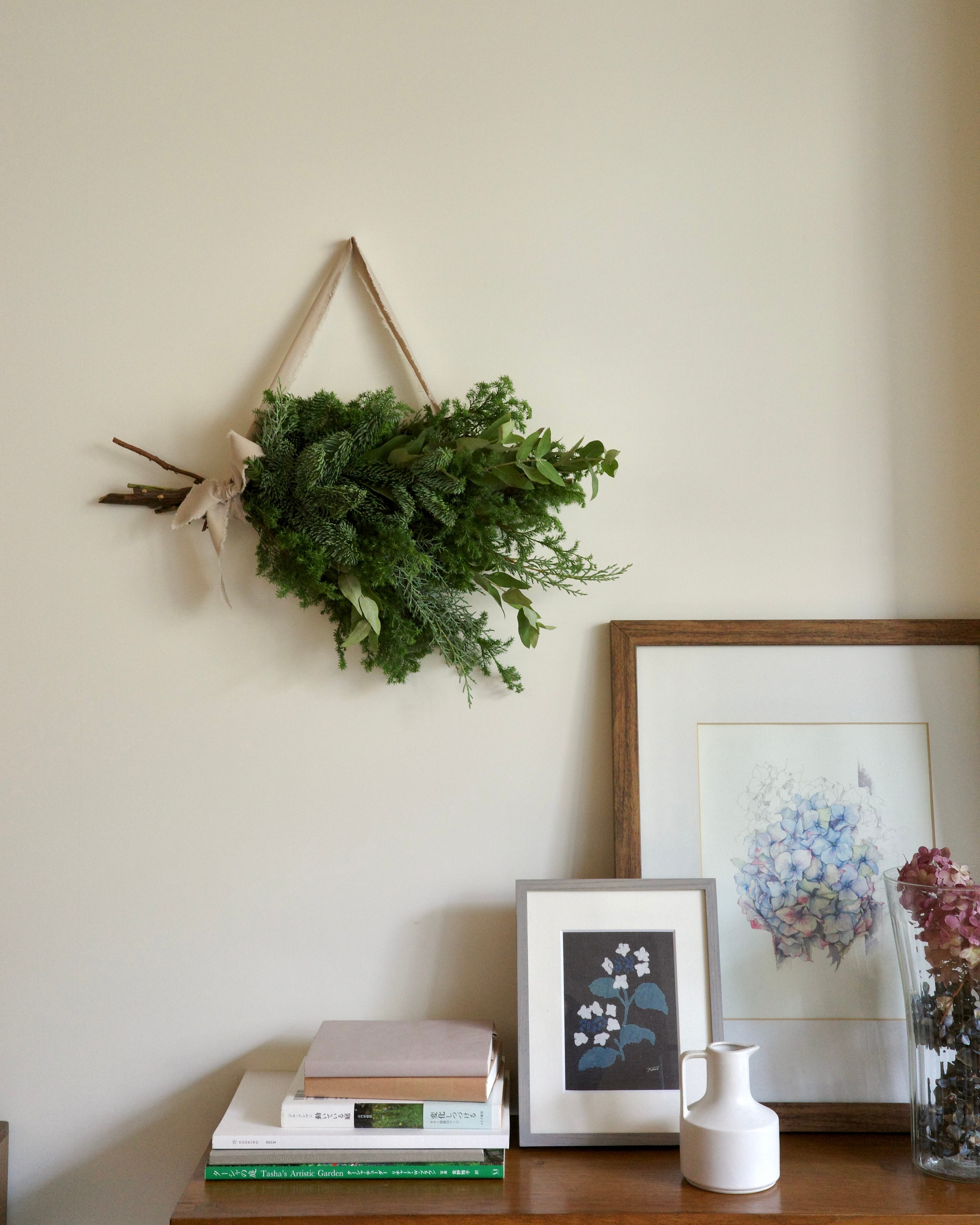 サツマ杉やヒバ、ユーカリなどのフレッシュな針葉樹とグリーンをラフに束ねてリボンでおめかしし、タペストリーのように横型に。