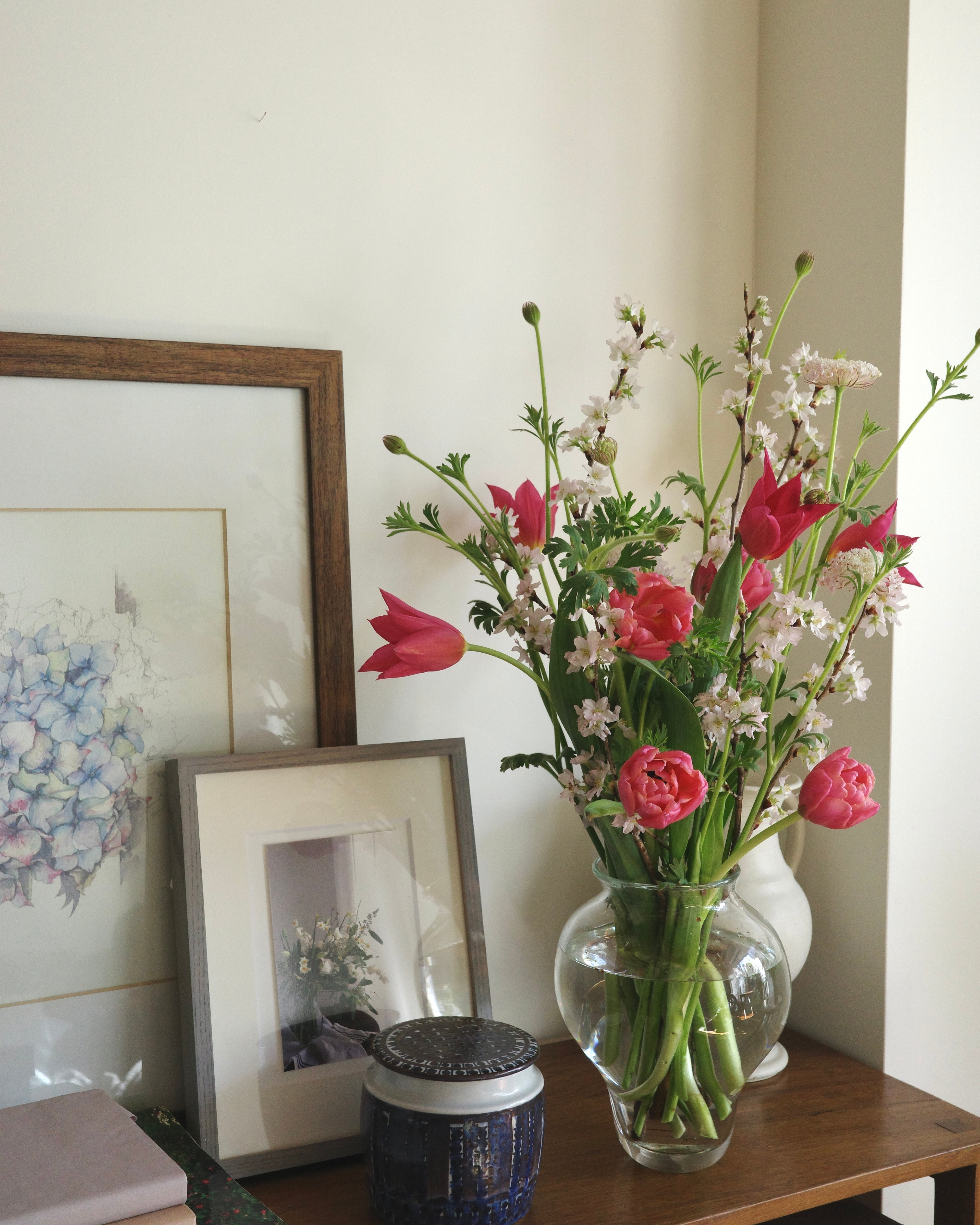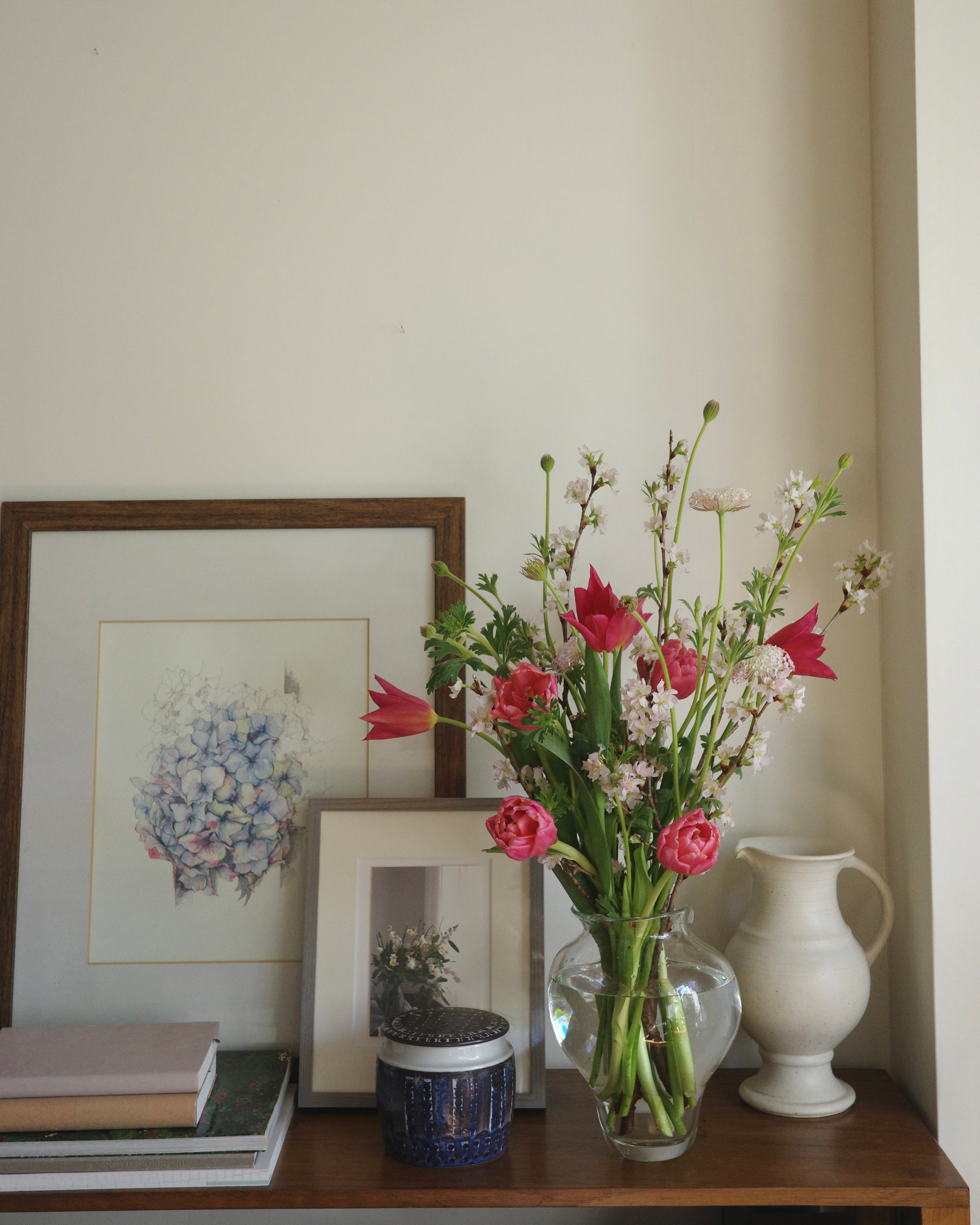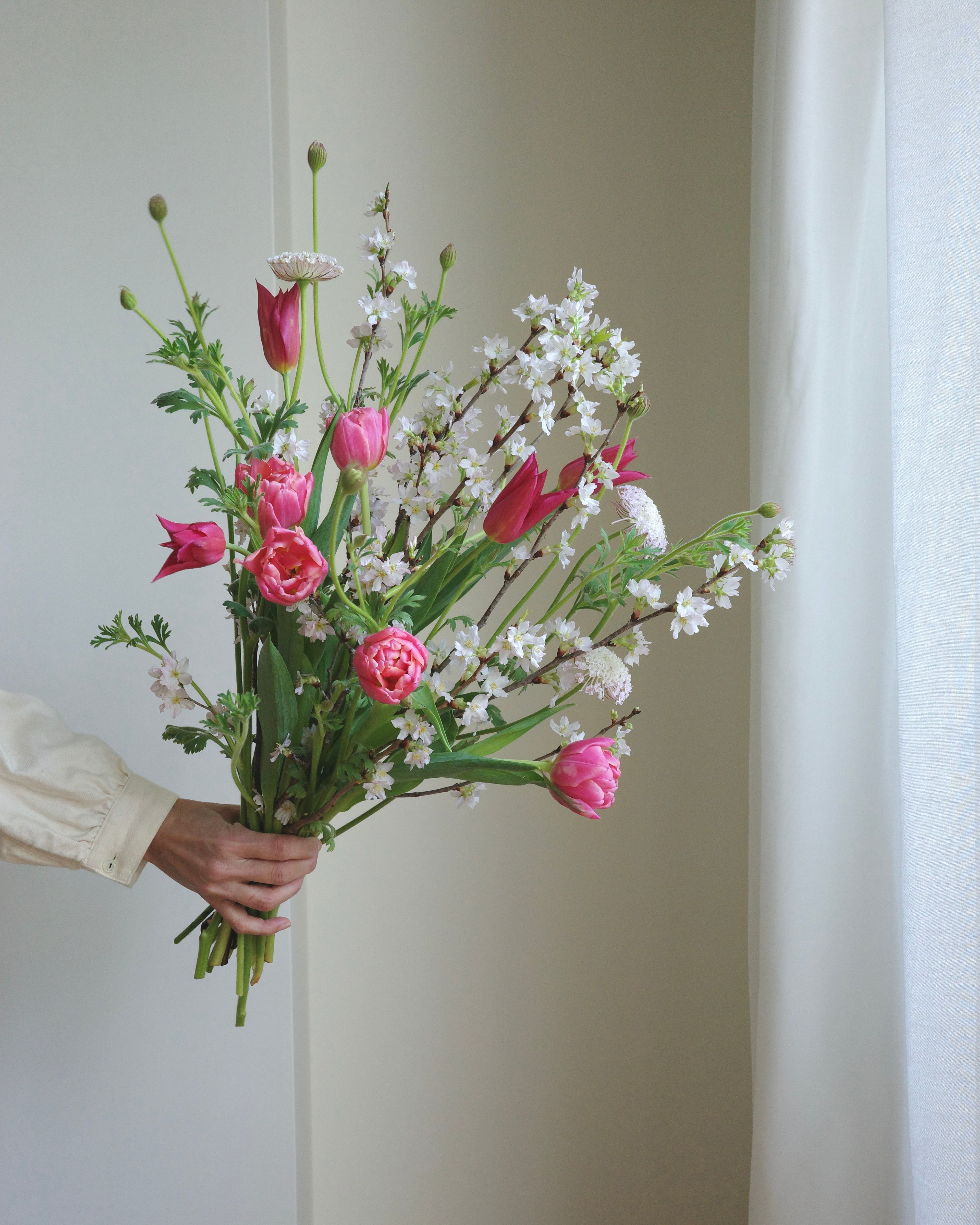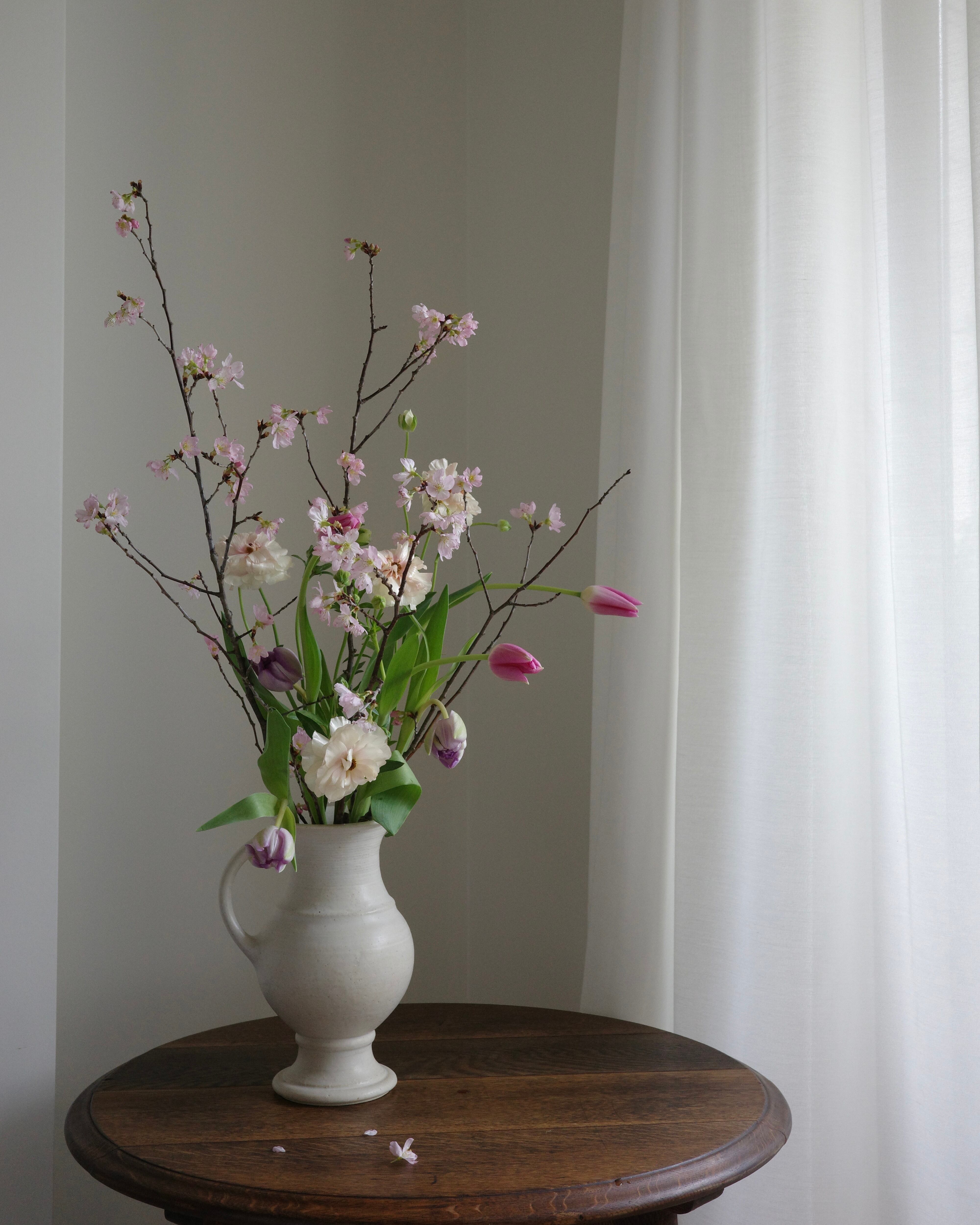 そのまま花瓶に挿して楽しめるよう束ねていますが、ぜひ紐を解き、枝の線と花茎の曲線が交差する様子を遊ばせて飾ってみてください。一足先のお花見を、お部屋の中で。
