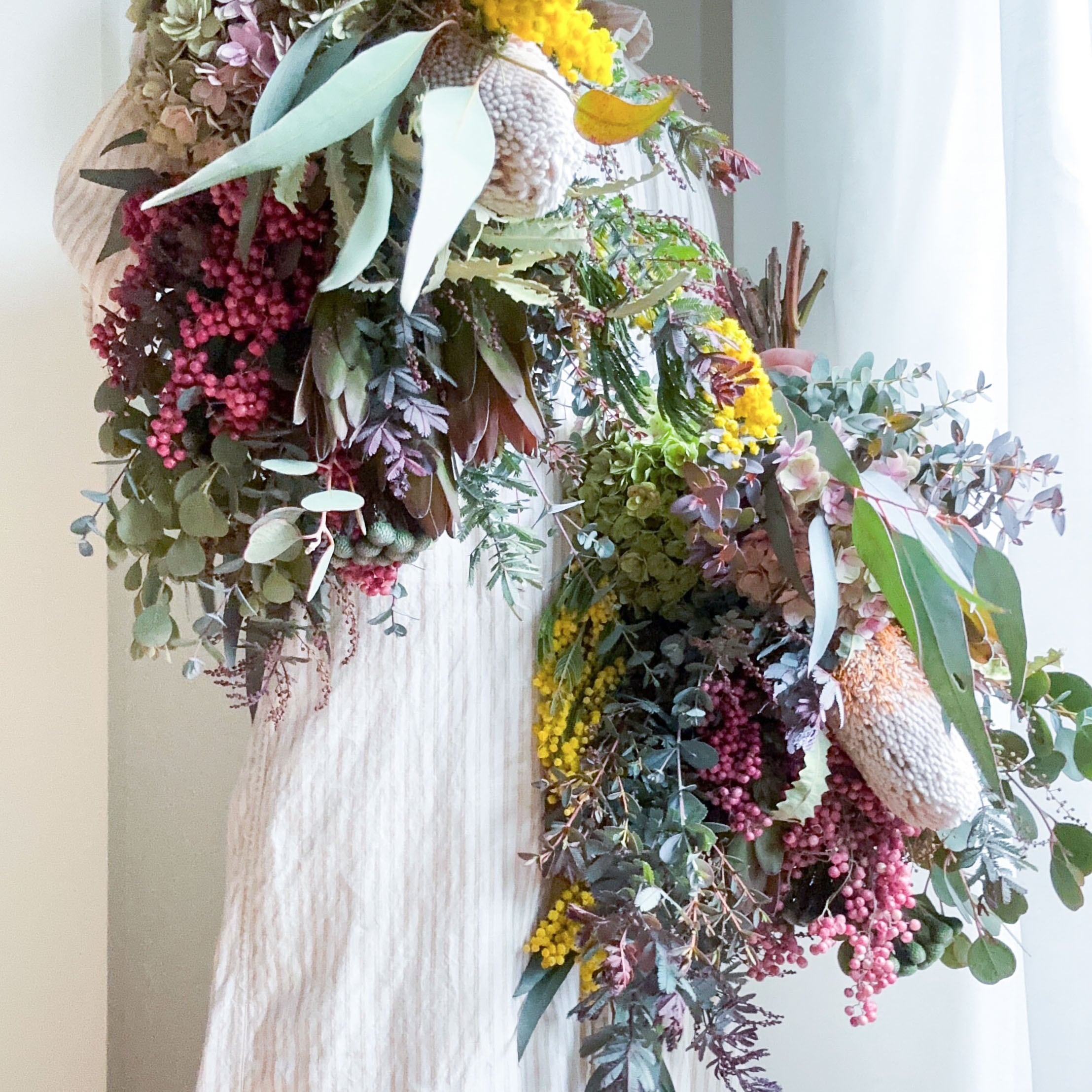 そしてお部屋に飾る際にスワッグとして吊るしていただくとそのままゆっくりとドライフラワーとなっていきます。